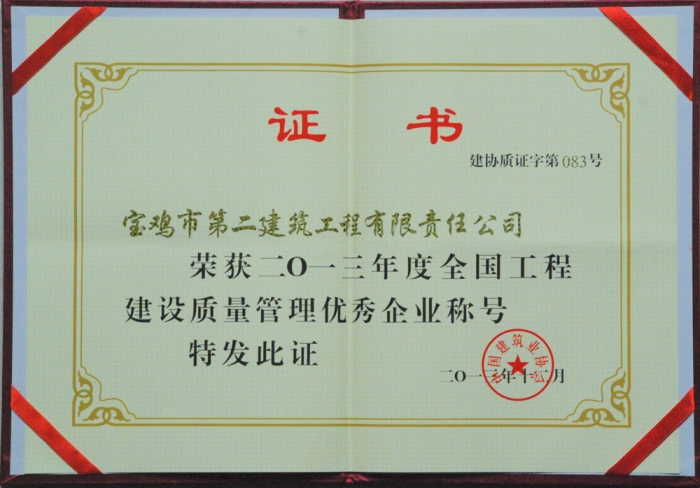2013年全國工程建設質(zhì)量管理優(yōu)秀企業(yè)